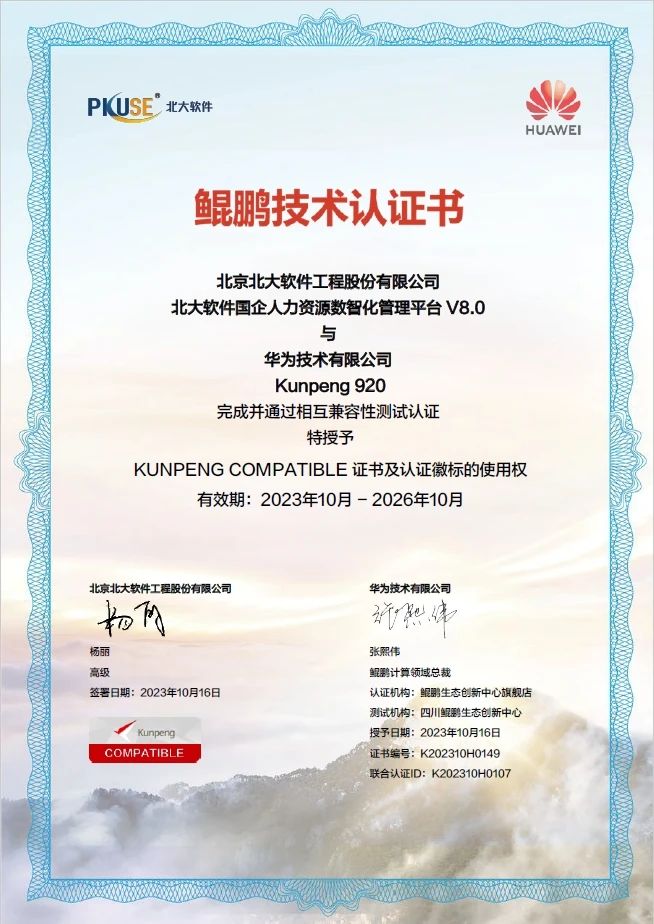 近日,北京北大軟件工程股份有限公司(以下簡稱“北大軟件”)和華為技術(shù)有限公司(以下簡稱“華為”)完成并通過了相互兼容性測試互認證。北大軟件自主研發(fā)的國企人力資源數(shù)智化管理平臺V8.0(P8 DHR)順利通過的華為Kunpeng 920 CPU的相互兼容性測試,并獲得產(chǎn)品兼容性互認證明證書。經(jīng)過嚴格的聯(lián)合測試驗證,雙方產(chǎn)品兼容性良好,運行穩(wěn)定、安全,可以滿足用戶的關(guān)鍵性應(yīng)用需求。